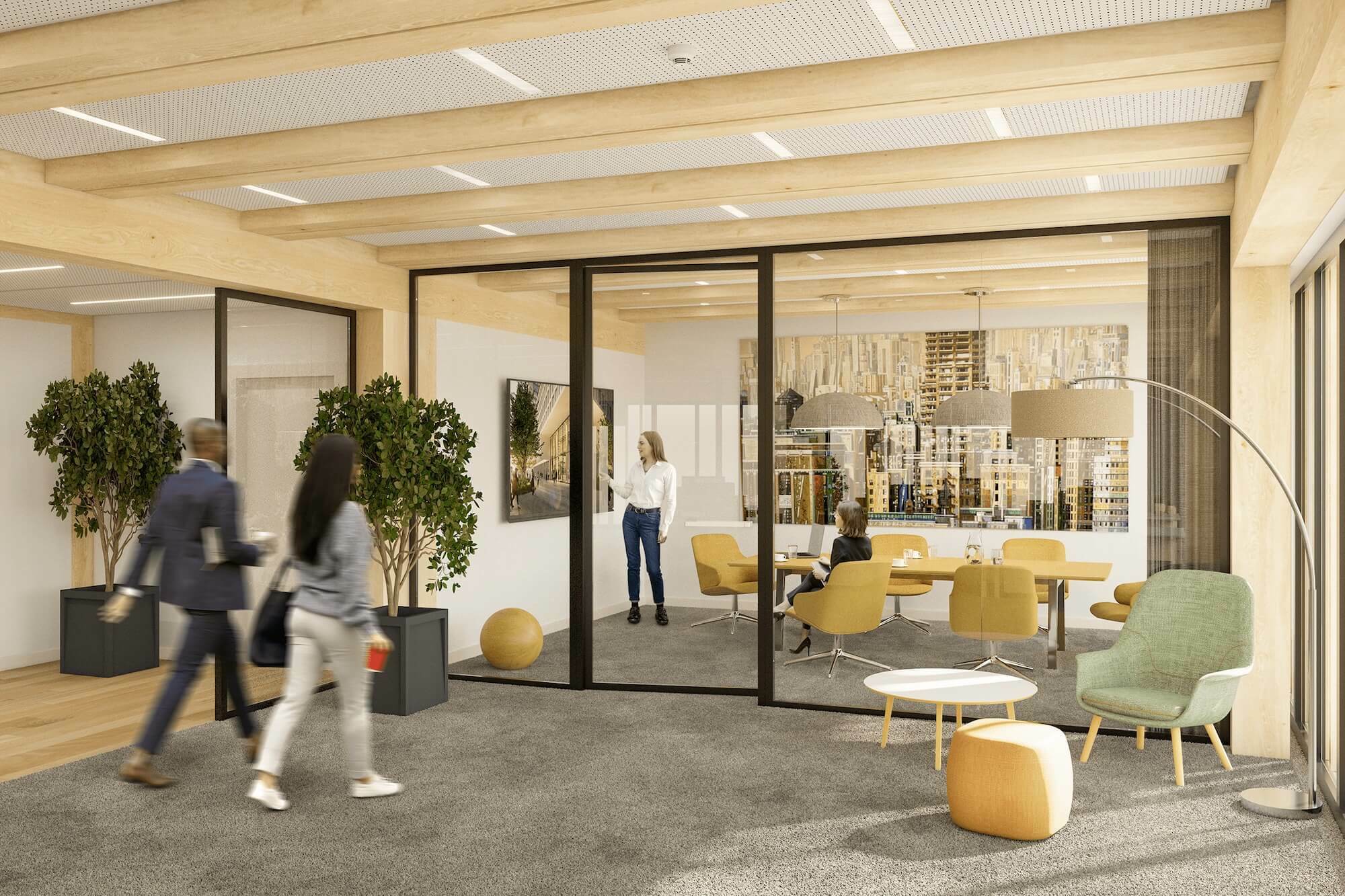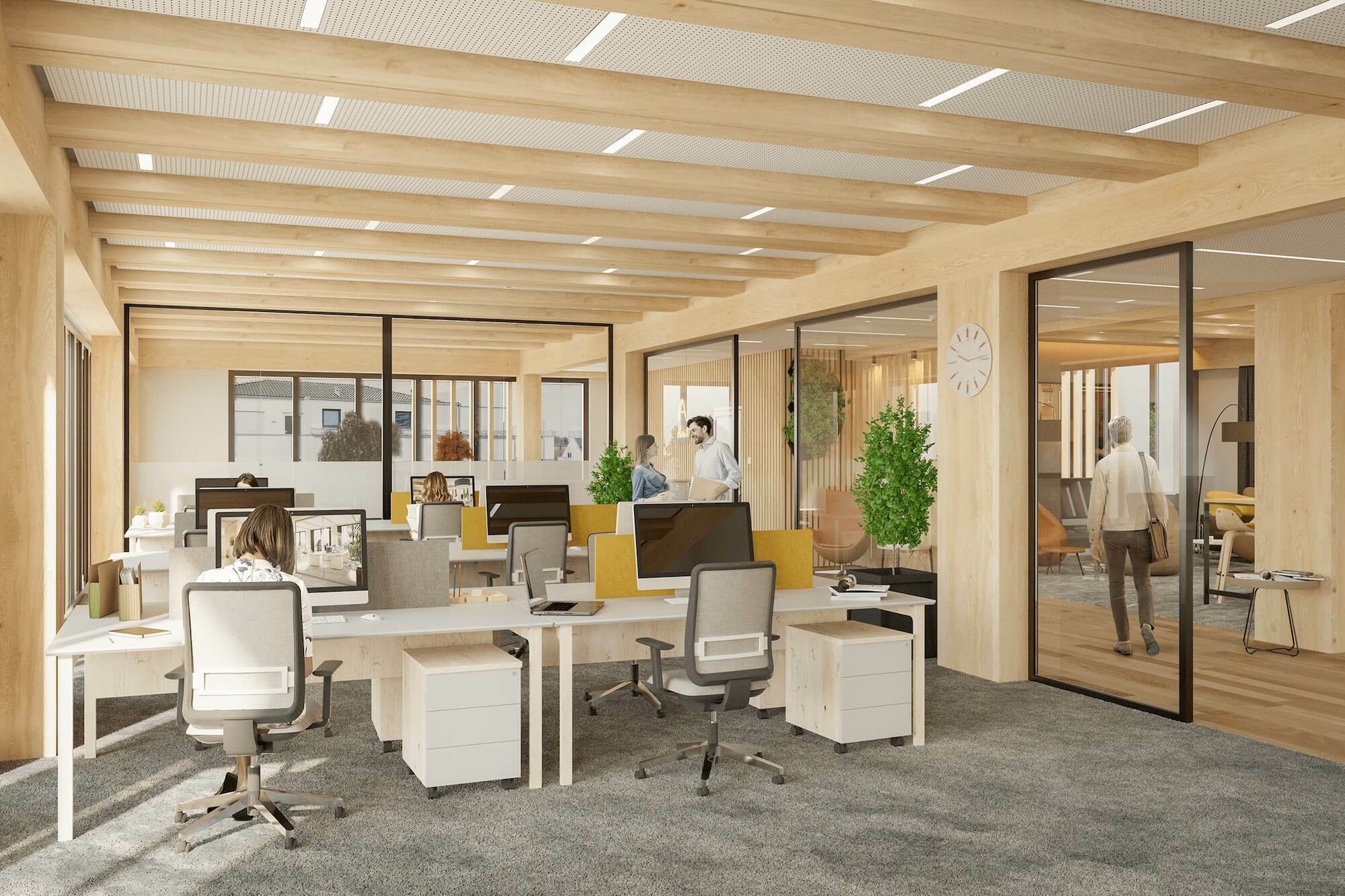 Die herausstechende Nachhaltigkeit und Sozialverträglichkeit des Gebäudes wurden [von unseren Prüfern] mit DNGB Gold und WiredScore Gold zertifiziert. Der Komplex wird vollständig in Holz-Hybrid-Bauweise mit FSC-zertifizierter Fichte gebaut.