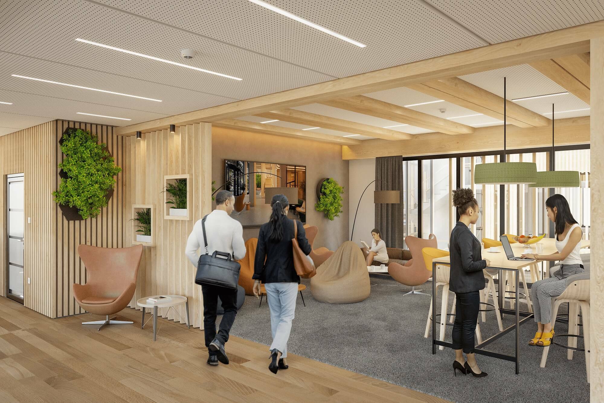 Die Rahmenbauweise ab dem ersten Obergeschoss bietet mit einer tragende Außenkonstruktion aus Holz volle Flexibilität bei der Gestaltung der Räume. Diese Bauweise vereint hervorragende Statik, hochwertigen Schall- und Brandschutz sowie Energieeffizienz. Der Einsatz von nachwachsenden Baumaterialien, sämtliche Nachhaltigkeitsmaßnahmen sowie ein umfassendes Grünflächenkonzept sorgen für einen erhöhten Wohlfühlfaktor und ein komfortables, gesundheitsförderndes Arbeiten. Damit stellt das Bauvorhaben bei Fertigstellung eines der modernsten, ressourcen- und umweltschonendsten Bürogeschäftshäuser Münchens dar.